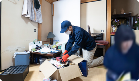 一つ一つ丁寧に、そして素早く確認し、貴重品、買取可能なもの、資源ごみ、不用品などに細かく分別。重量のある物は壁や床を傷めないように慎重に運搬していきます。